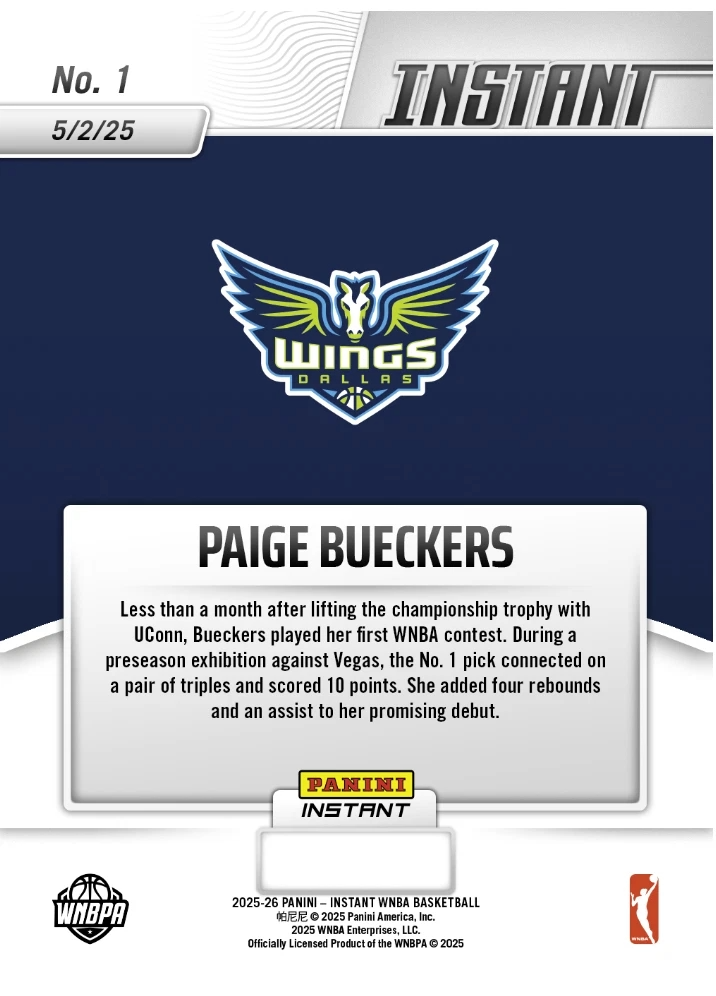 WNBA - Paige Bueckers - 2025 Panini Instant 'WNBA Preseason Debut' Rookie Card (RC) Dallas Wings